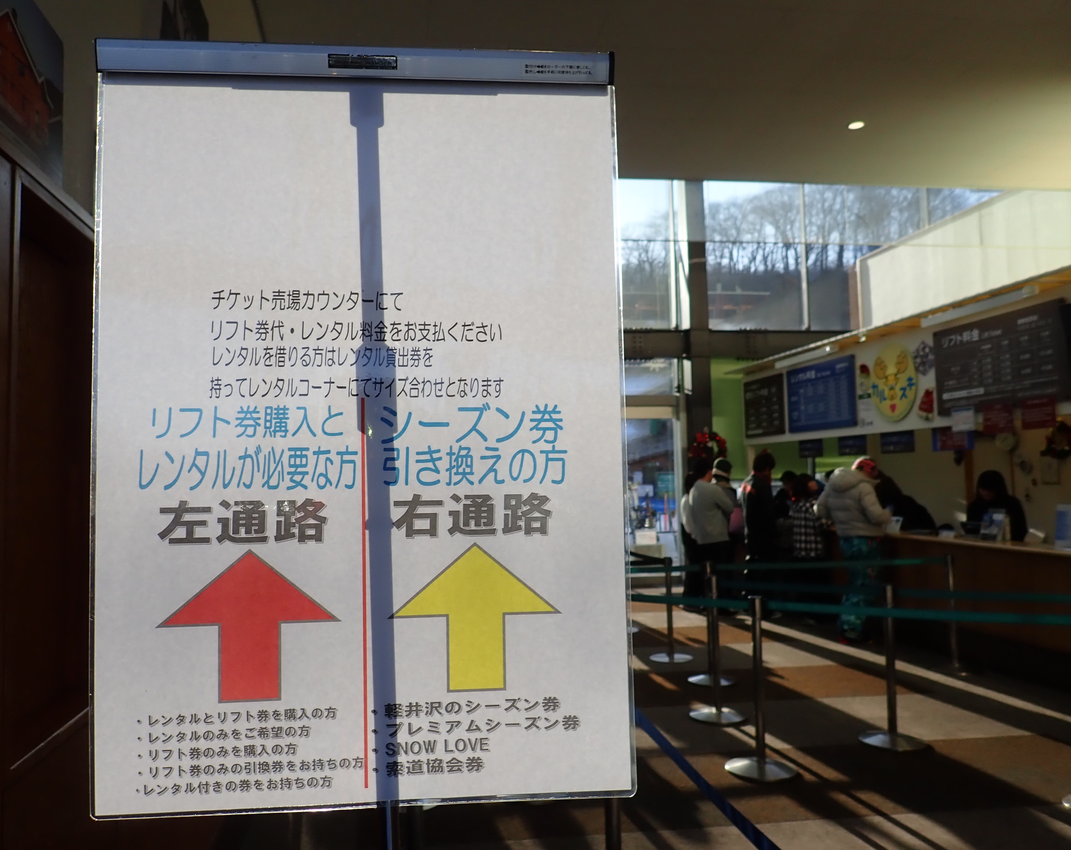 ↓↓↓お休みの日は、こんな風に「リフト券購入(レンタル)」と、「シーズン券引換」の列が分れています。